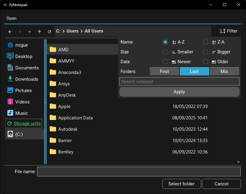 Creates a SimpleKivy file dialog to open a directory.